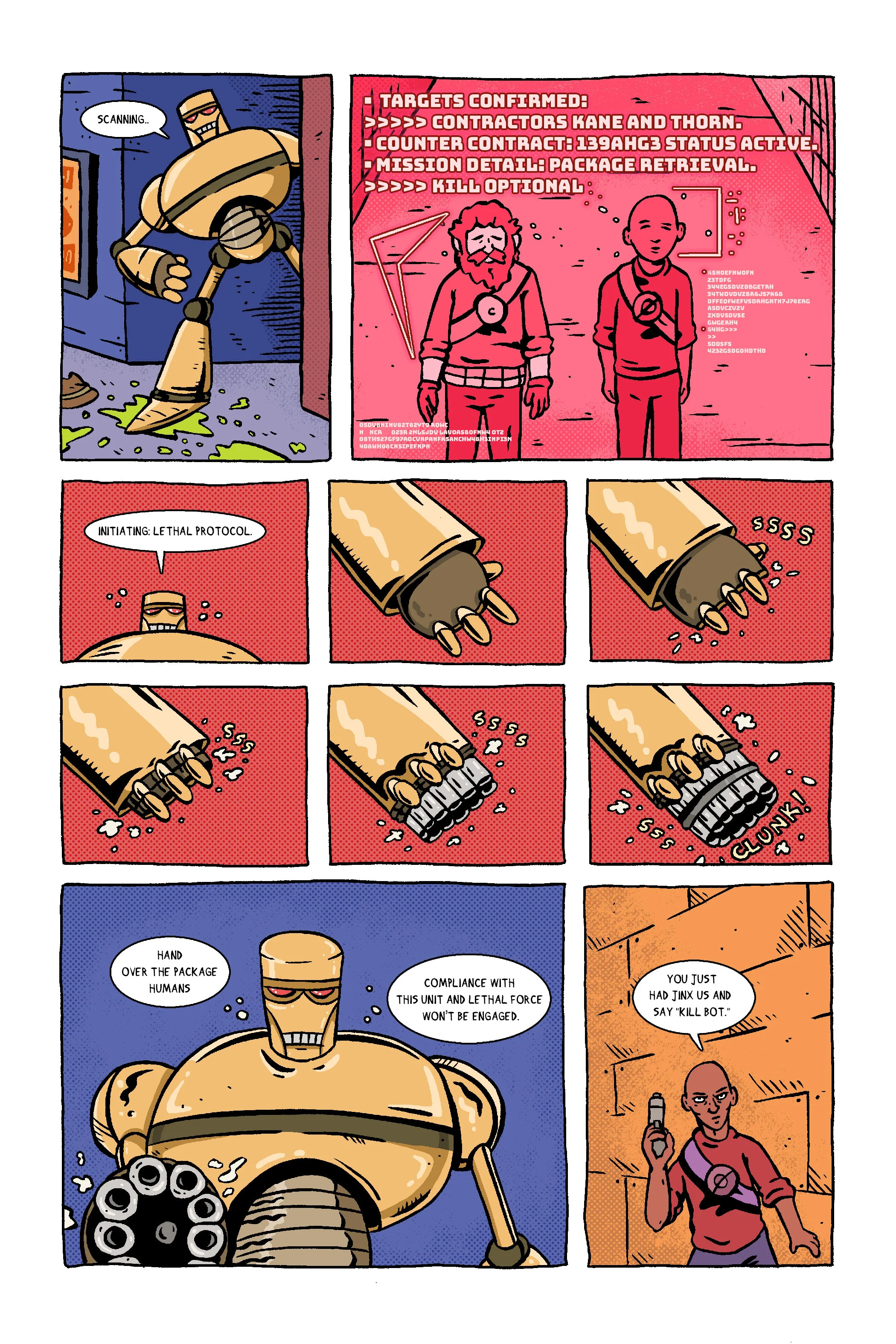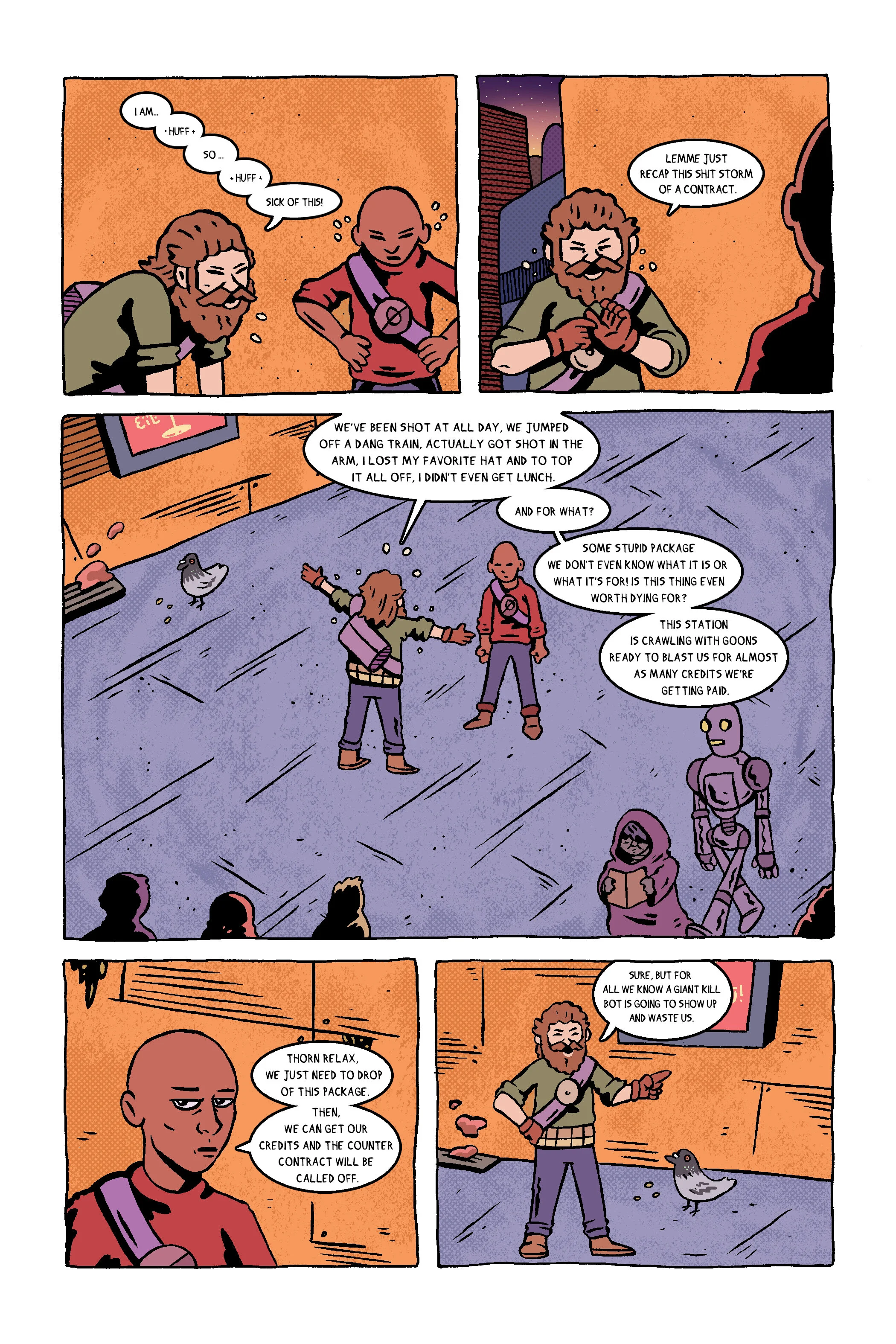 For The Money: Part 2 is the final part of the first adventure in the series. Wrapping up the mysterious contract that has sparked the interest of every goon on Titan Station. Thorn and Kane wait on their buddy Cass to bail them out while fighting in allies, bars and anywhere else they get recognized. (Full colored, 39 pages.)